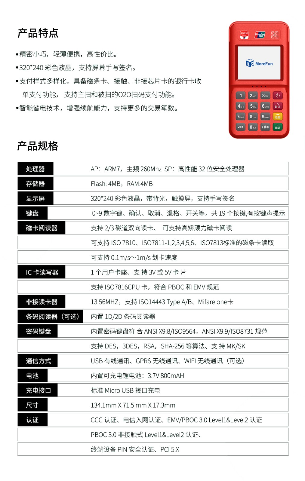 首页>>平山产品中心>>平山手持无线POS 平山电银支付-4G+扫码枪 高配版 * 性能优越:32位高性能ARM11安全CPU;整机通过业内更先进的PCI PED4.X 安全认证及国内受理终端PIN输入设备安全评估检测认证,多项措施保障金融交易的安全;* 时尚外观:外形小巧携带方便,高抗跌落性能、宽工作温度、防水防尘设计、外壳坚固耐刮、户外携带式作业更加耐久可靠。* 通讯备份:支持2G-3G扩展;* 超长续航:3.7V-800毫安稳定续航能力,智能电池管理保证持续工作18小时,待机72小时。 标准配置 返 回